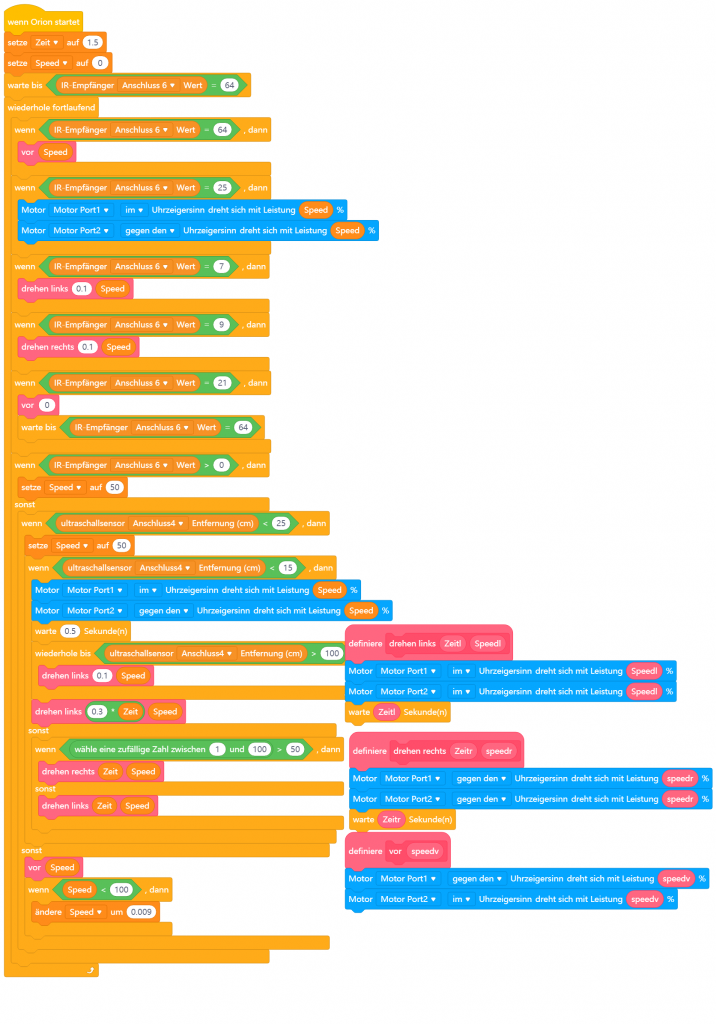Das größte Problem Problem besteht darin, dass viele Mblock Seiten nicht mehr laufen (404), daher sind die Tutorials zum Teil schwer zu finden. Schwerer wiegt, dass die mblock Software keinen Zugriff auf das Programm im Ranger erlaubt. Das führte dazu, dass nach einem Programm-Update der IR- Sensor nicht mehr wußte, was er mit den Meldungen der Fernbedienung machen sollte. So sieht das Programm heute aus. Man kann mit der Fernbedienung steuern, ansonsten übernimmt die automatische Steuerung den Ranger. Der gondelt dann durch die Wohnung und nimmt nach und nach alle dunklen Ecken aufs Korn!